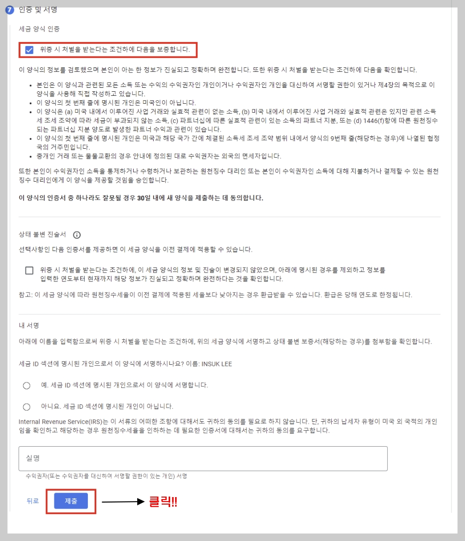 여기까지 작성했다면 W-8BEN 양식이 모두 마무리되었습니다.