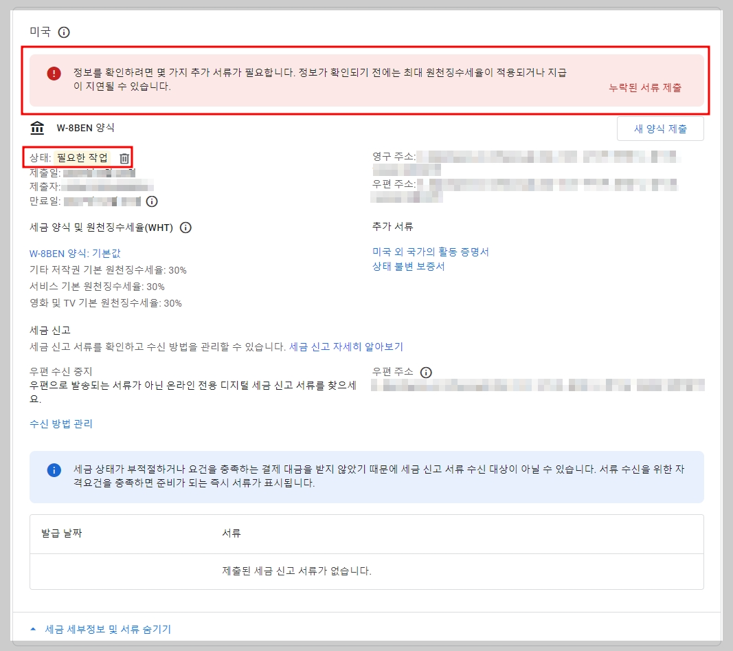 애드센스 세금 정보 입력 후, "문서 누락" 경고가 뜰 수 있습니다.