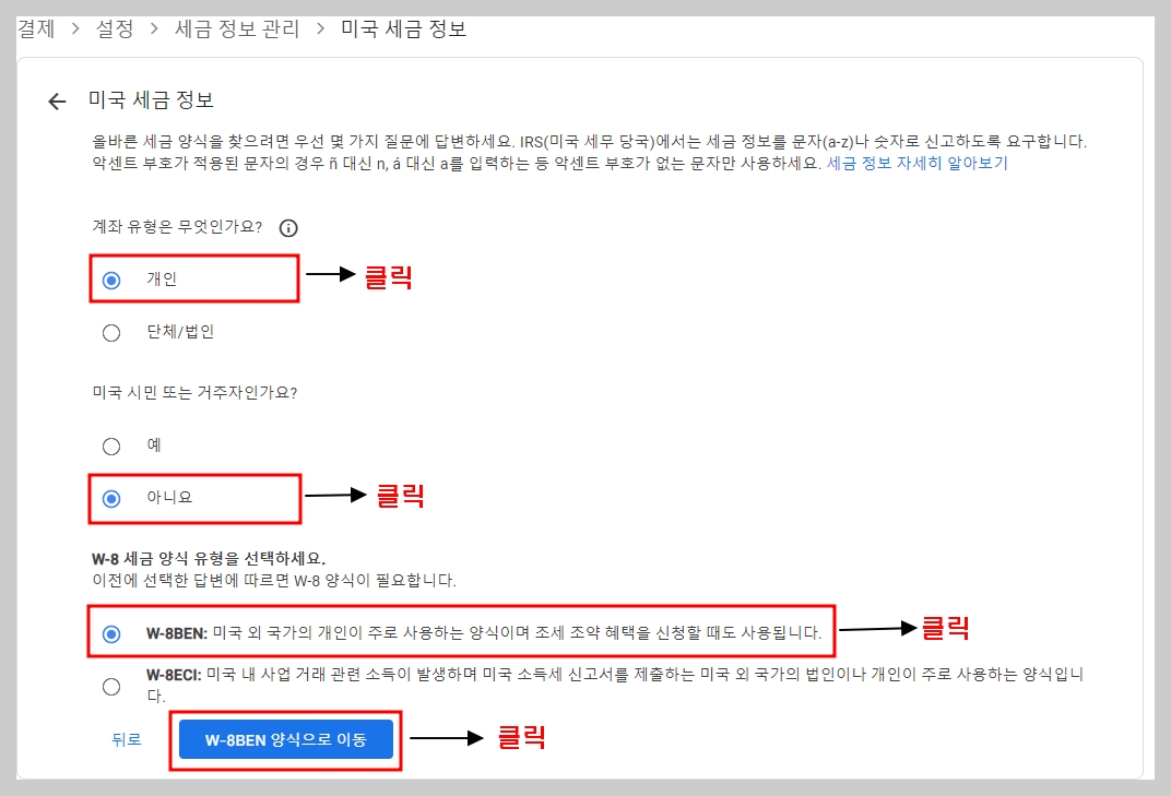- "W-8BEN" 양식(개인용) 선택
