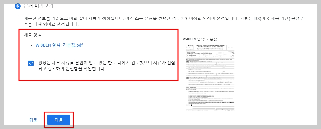 | 4단계 | 양식 종류 'W-8BEN' 선택 |