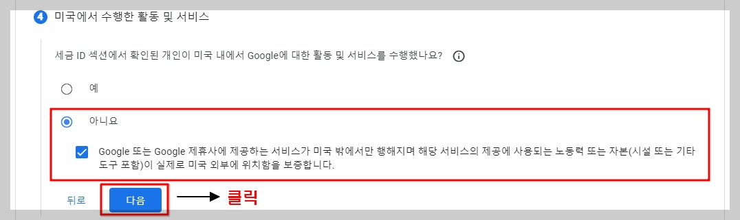 미국에서 수행한 활동 및 서비스 역시 국내 사용자를 대상으로 하고 있기 때문에 '아니요'를 선택 하시면 됩니다.