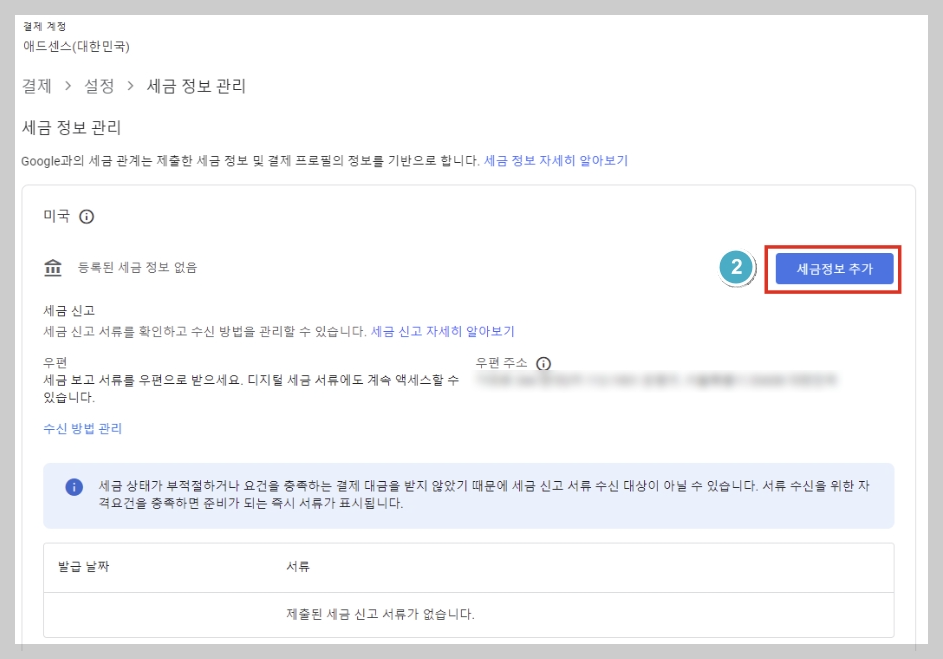 클릭하시면 아래와 같은 페이지가 나오실 텐데, 미국 칸에 있는 세금 정보 추가 버튼을 클릭하시면 됩니다.