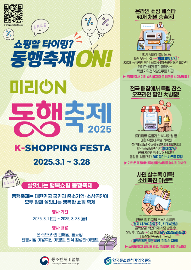 소비 진작과 내수 활성화를 위한 **‘미리 온(ON) 동행축제’**가 3월 1일부터 28일까지 진행됩니다. 중소기업과 소상공인의 제품을 할인된 가격에 구매할 수 있는 기회로, 온·오프라인 50여 개 유통채널이 참여하여 최대 80% 할인 혜택을 제공합니다.