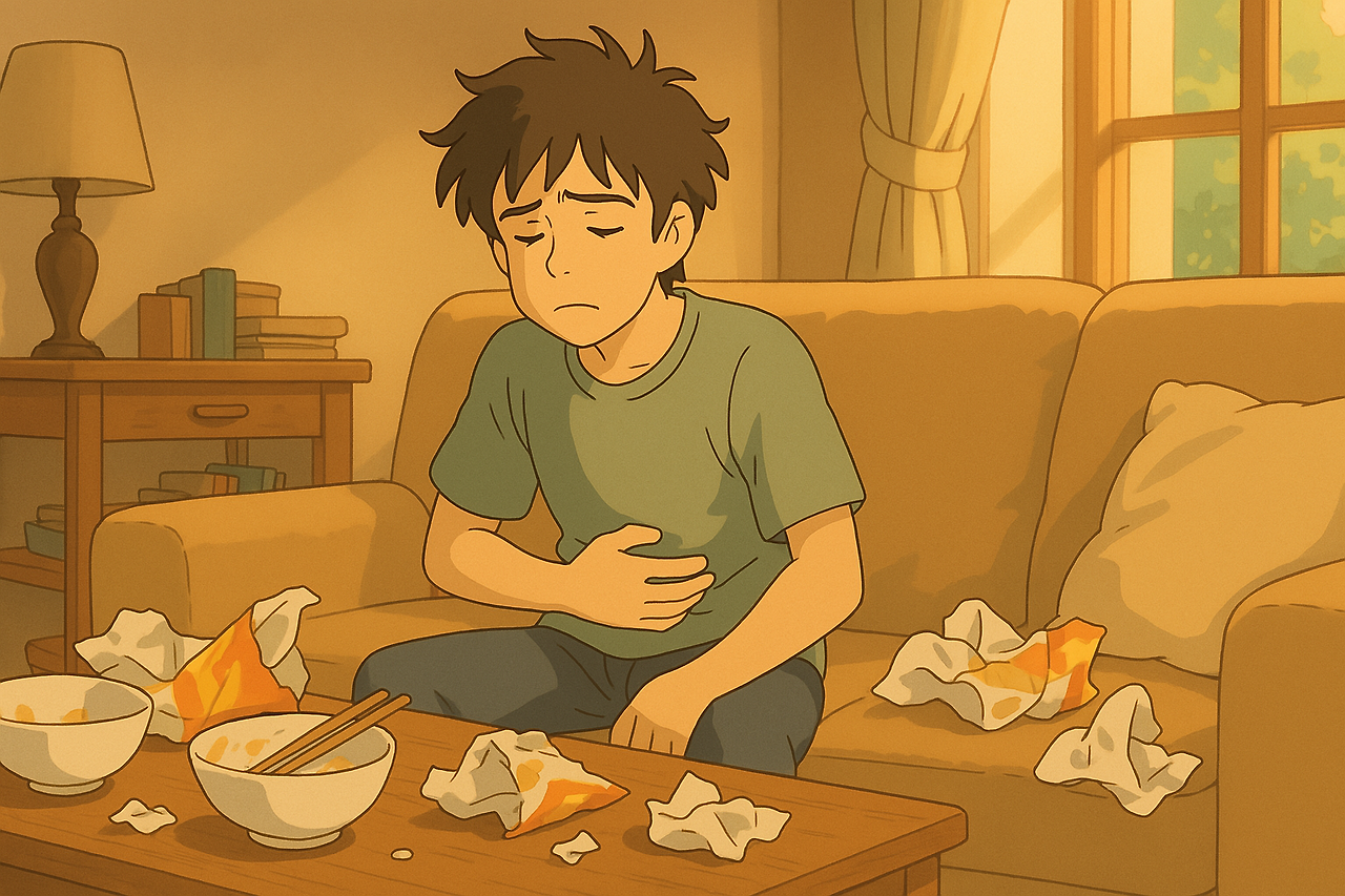 - 과식, 폭식, 기름진 음식 섭취
